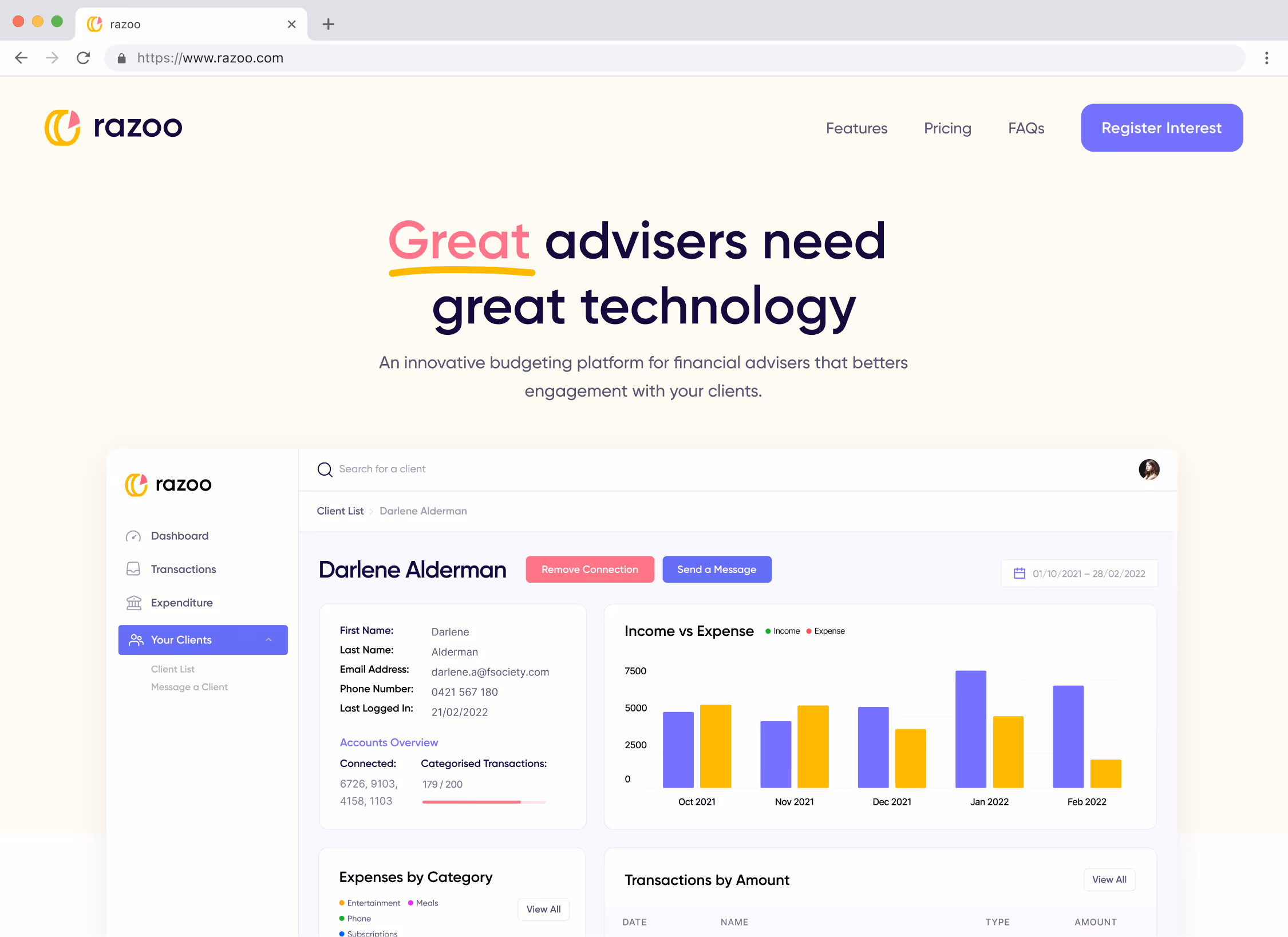 In 2022, Razoo, an innovative budgeting platform designed for financial advisers, approached me to create their brand identity and design their website. Razoo distinguishes itself in the fintech space with its unique approach to enhancing client engagement through intuitive budgeting tools. My task was to encapsulate this innovative spirit in both their branding and website, setting a foundation for Razoo’s impactful presence in the financial advisory sector.